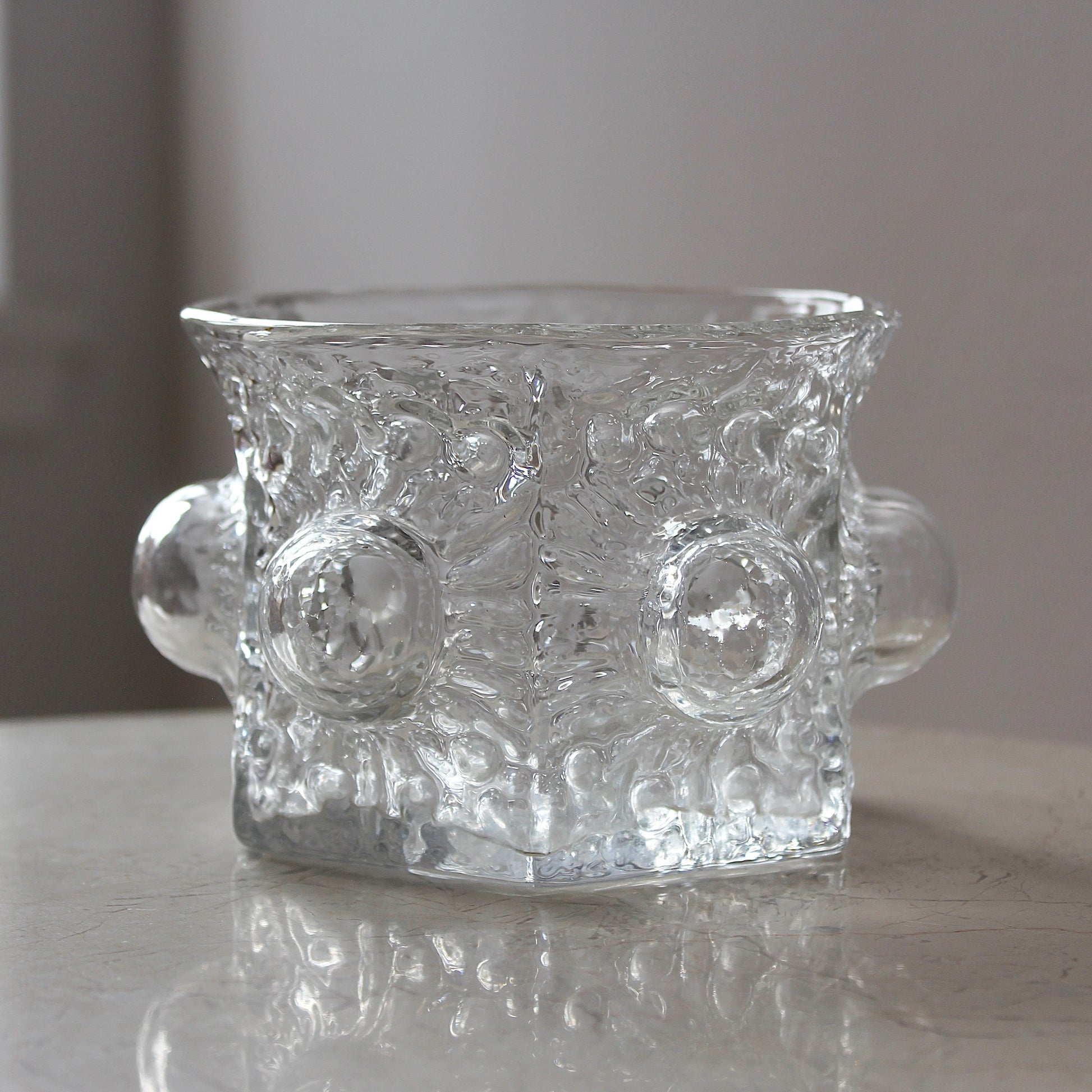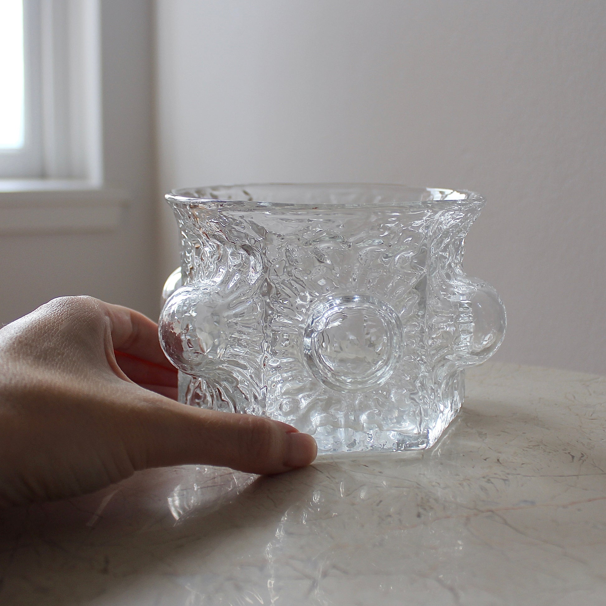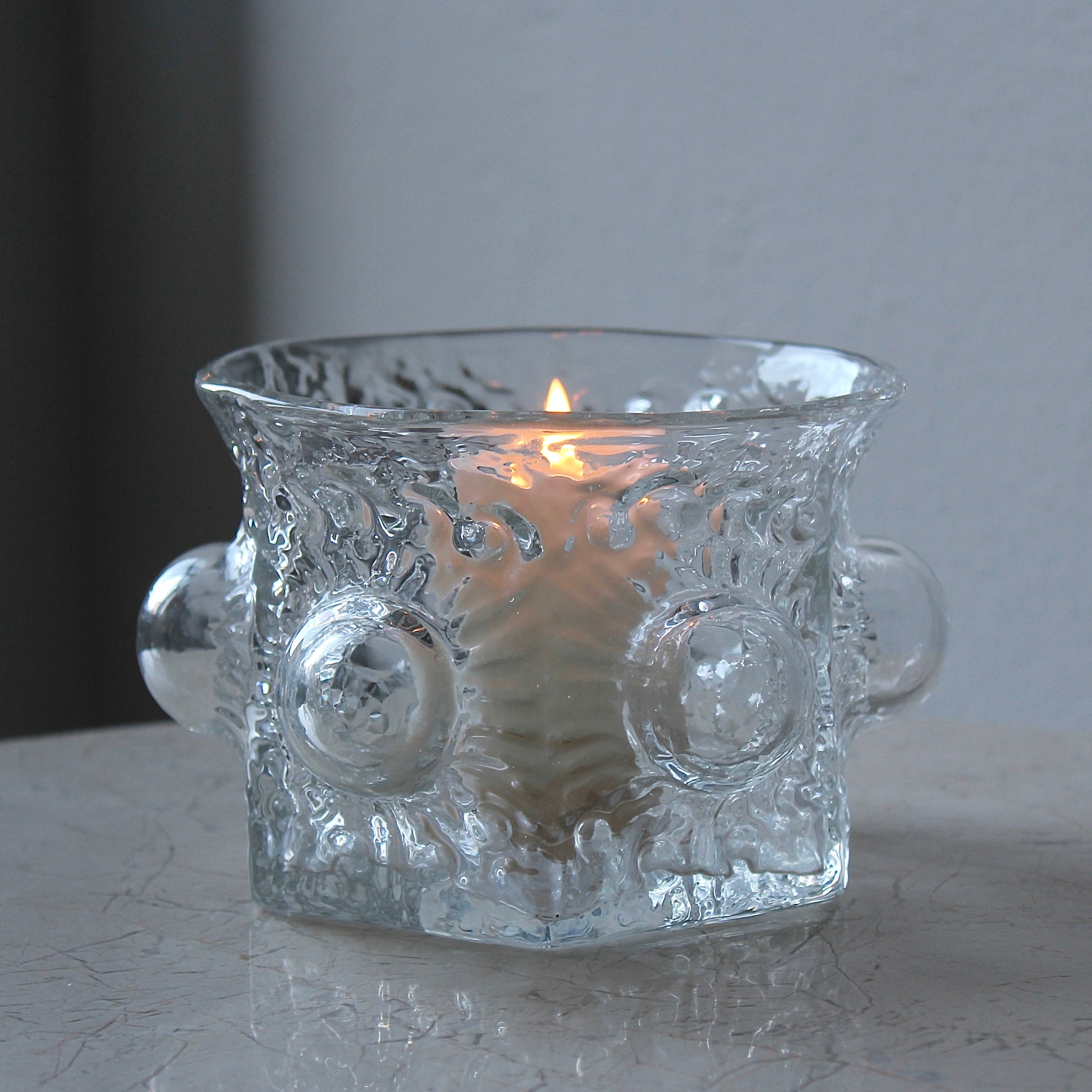 A beautiful textured crystal vase/candle holder with abstract bubble relief designed by Rune Strand (1924 - 2000) for Sea Glasbruk in Sweden. Sea was founded in 1956 and is now part of Orrefors Kosta Boda AB.