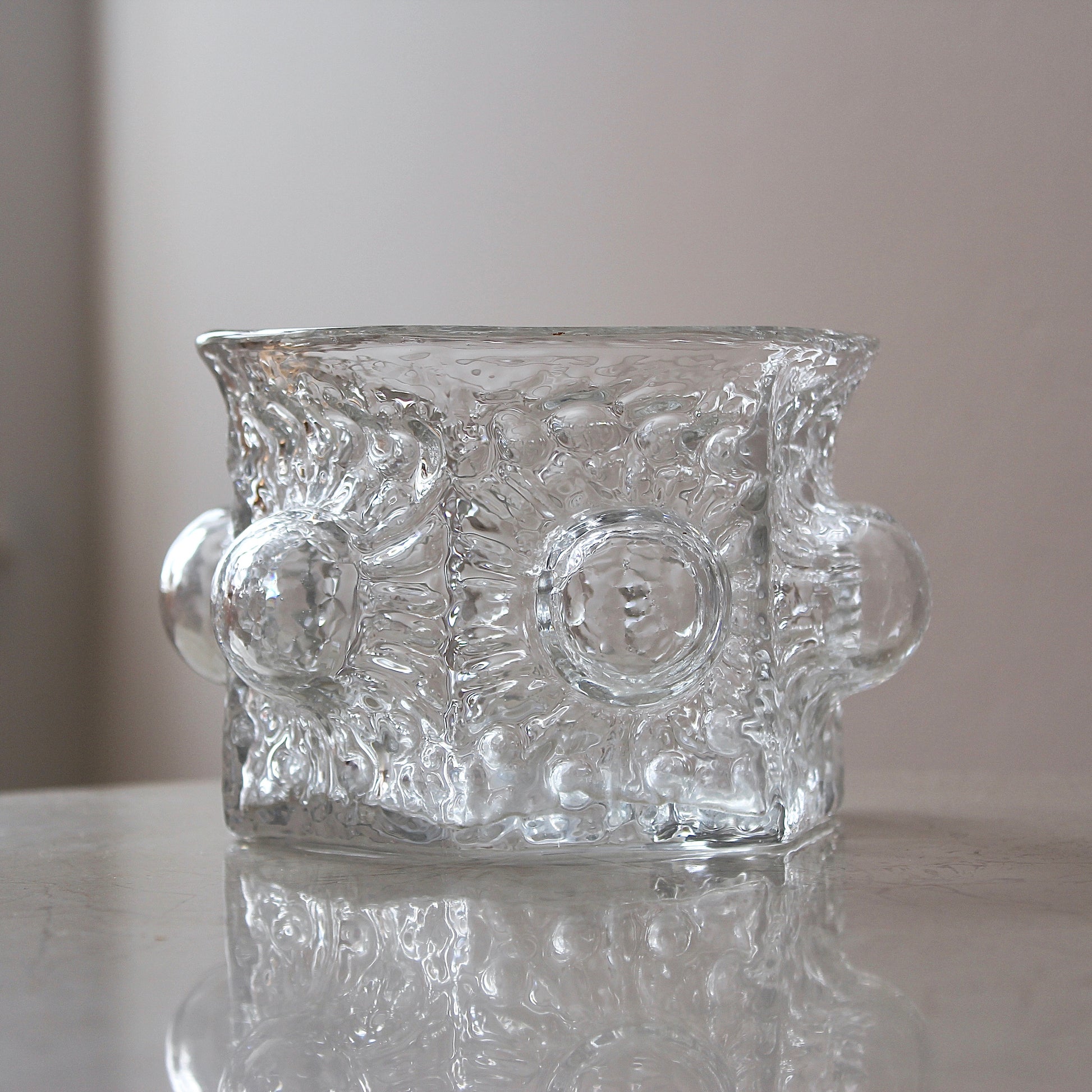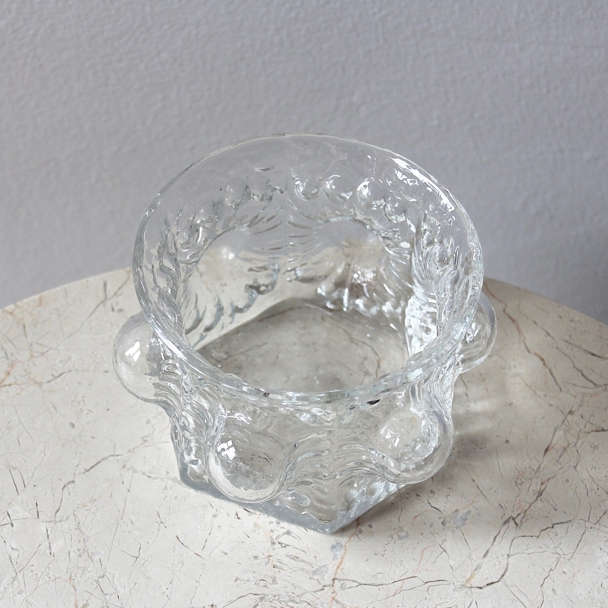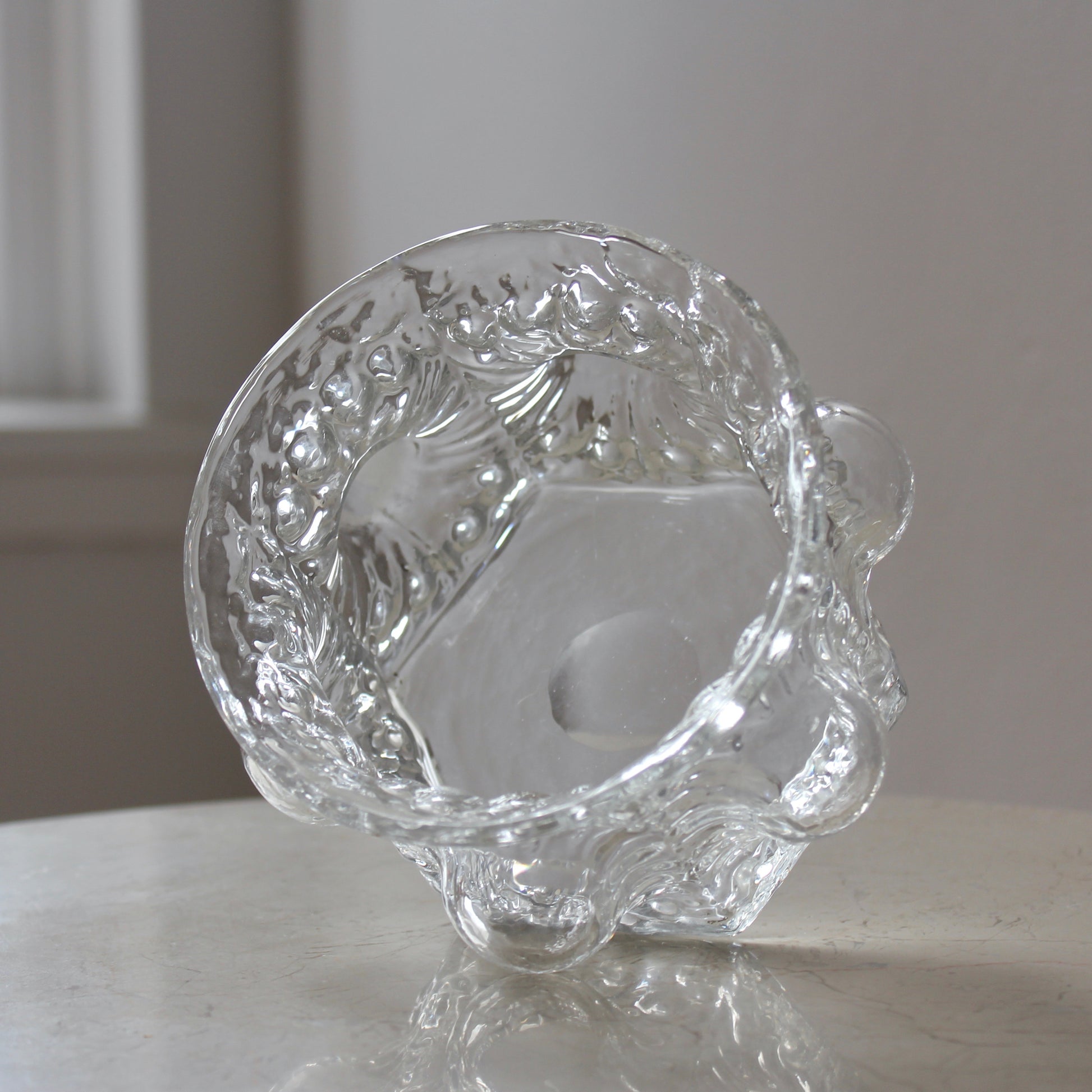 A beautiful textured crystal vase/candle holder with abstract bubble relief designed by Rune Strand (1924 - 2000) for Sea Glasbruk in Sweden. Sea was founded in 1956 and is now part of Orrefors Kosta Boda AB.