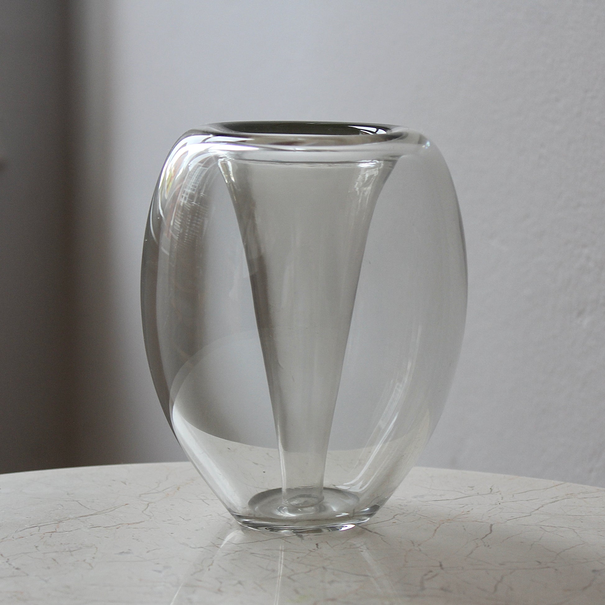 This vase features heavy clear glass blown into a minimal ovoid form with a cone shaped cavity that resembles a 'typhoon' - which happens to be the name of the design.