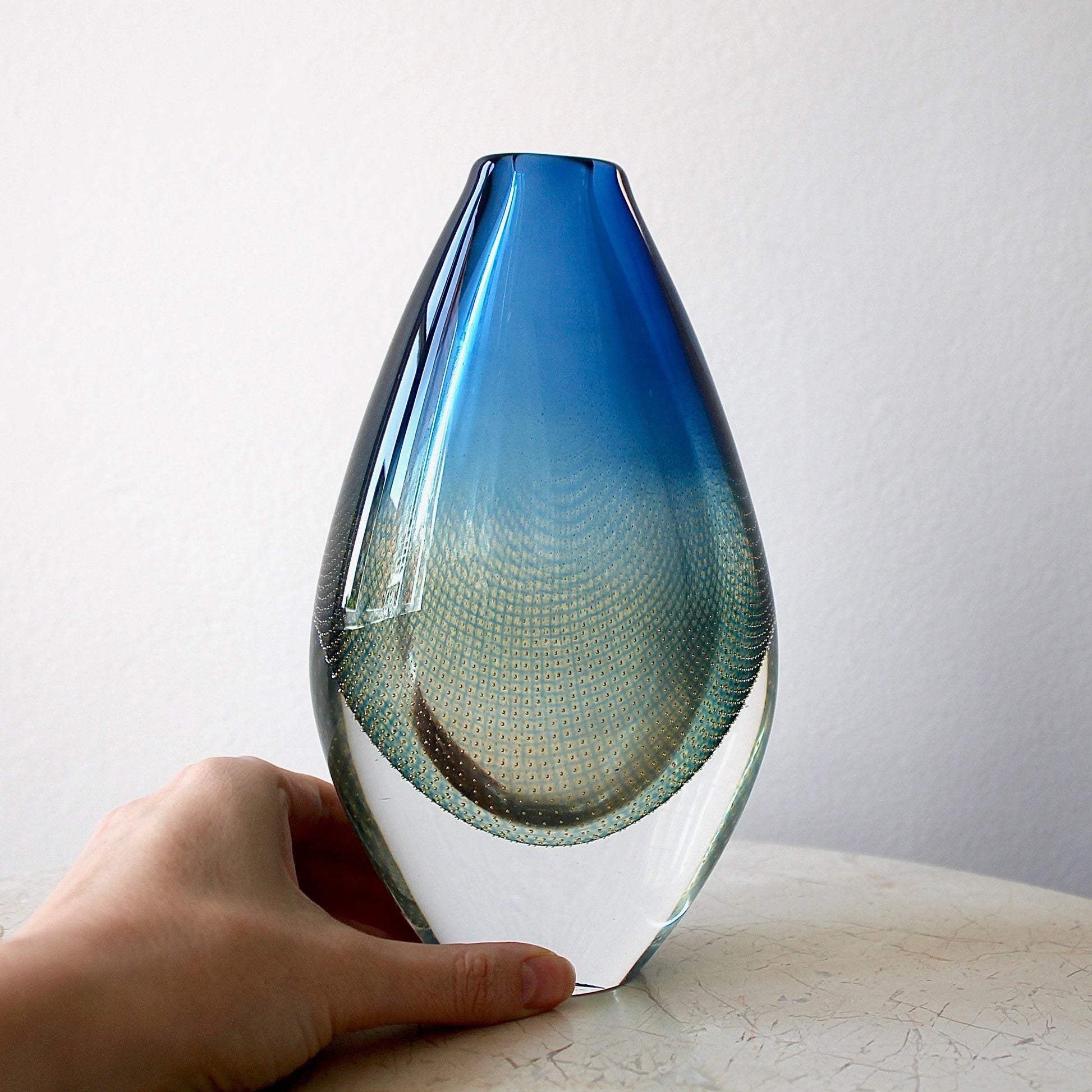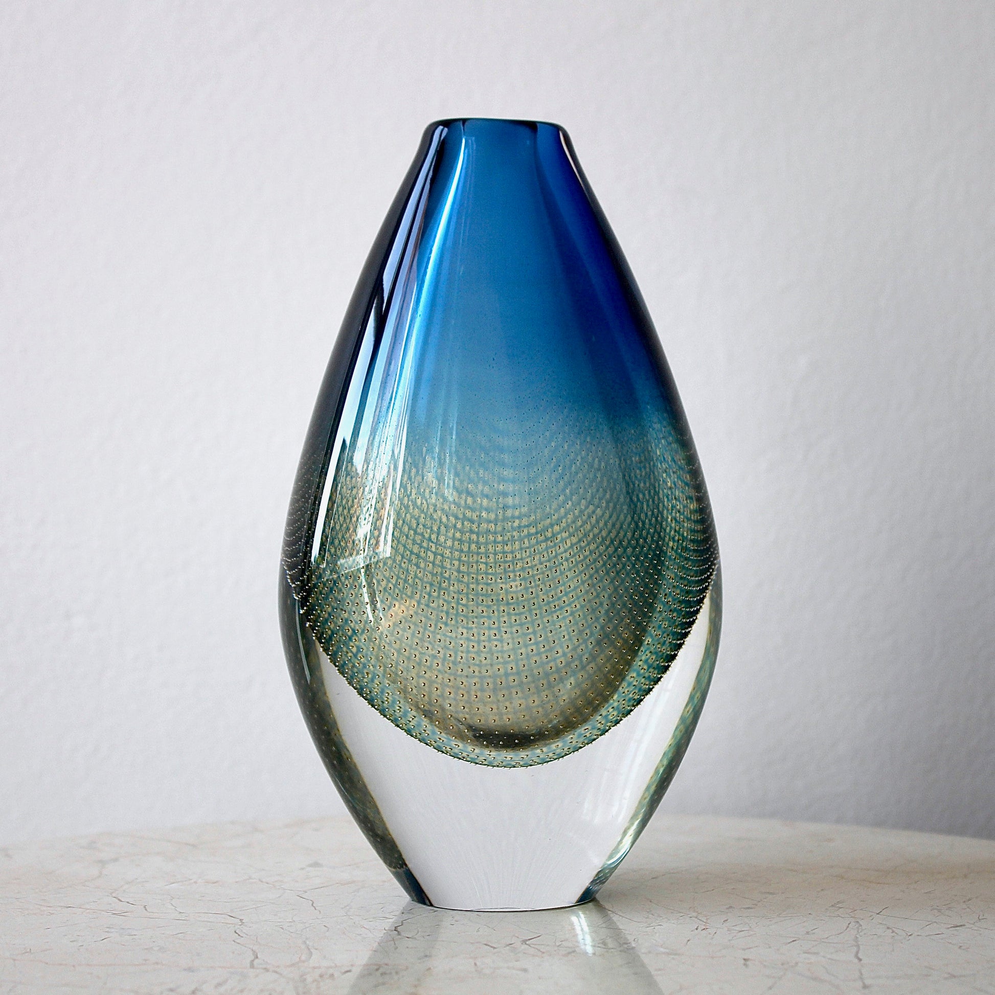 This stunning original Modernist vase features hand-blown clear crystal that encases an underlay of gold and blue tones in a lattice pattern with internal bubbles. It was designed by the renowned Swedish glass artist Sven Palmqvist using his Kraka technique, which he developed with Orrefors in 1944. Here, the illusion of a net appears suspended within the glass. The unique effect is created by the use of a copper wire mesh that traps air bubbles when an outer clear encasing of glass is applied – all by hand.