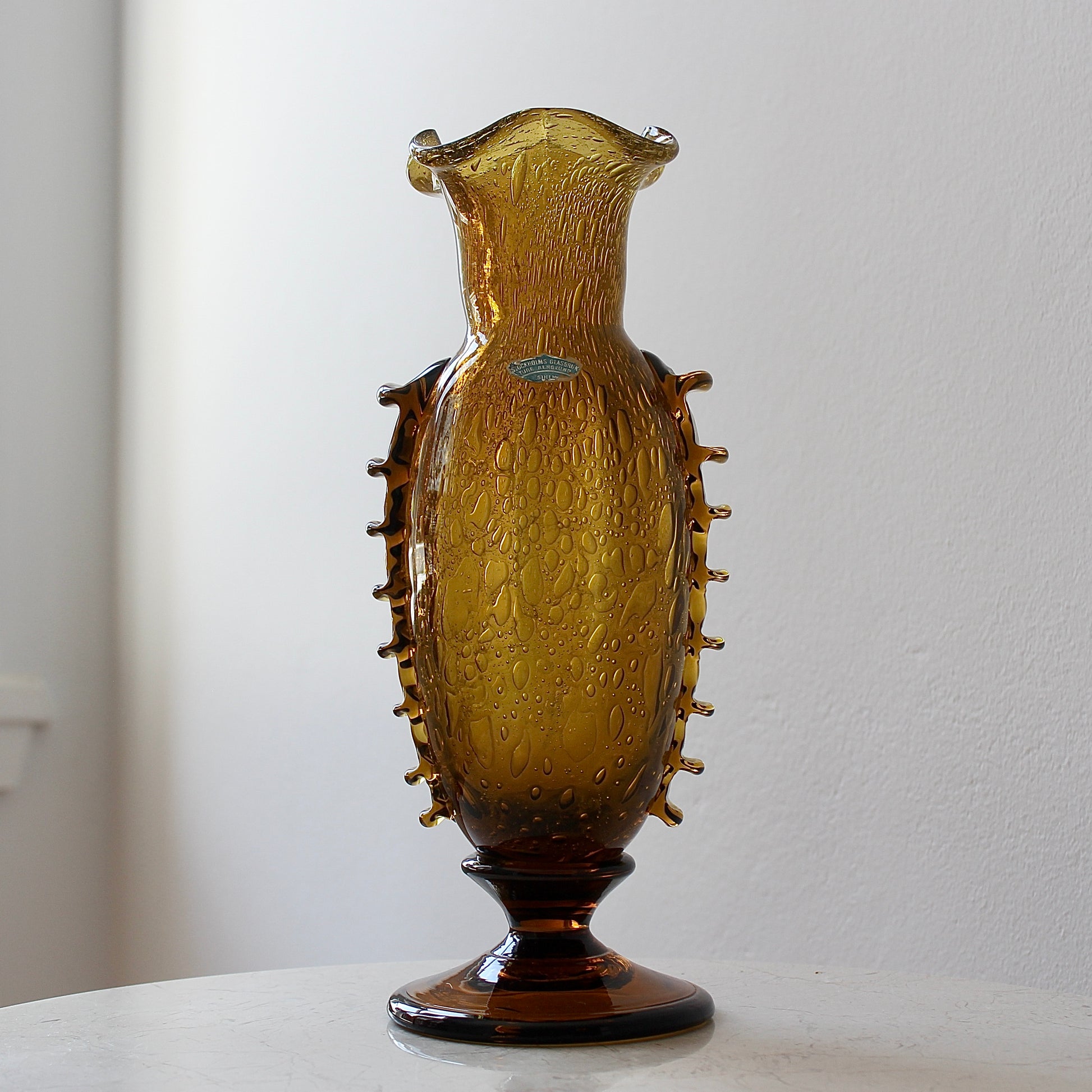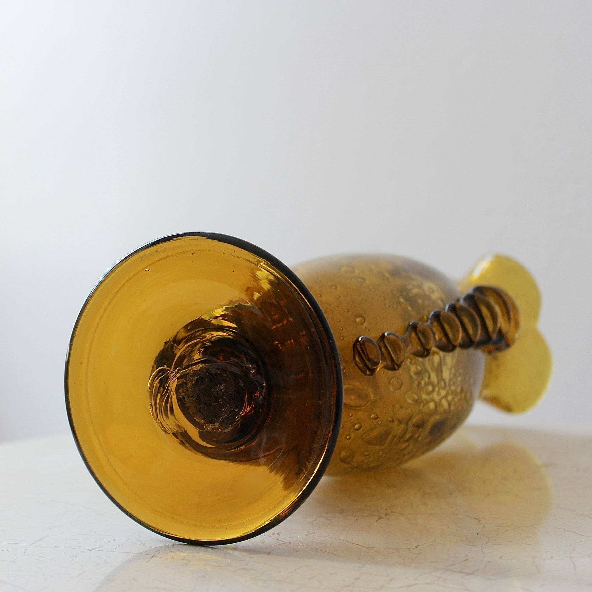 This heavy vase features solid hand blown transparent caramel glass with beautiful internal bubbles and applied decoration. It was designed by Ture Berglund, who founded Stockholm Glasbruk in 1936 with his wife Lily. He operated the glassworks between 1933 - 1980. Berglund's pieces are widley known for this technique but this model and colour make it a rare example of his work.