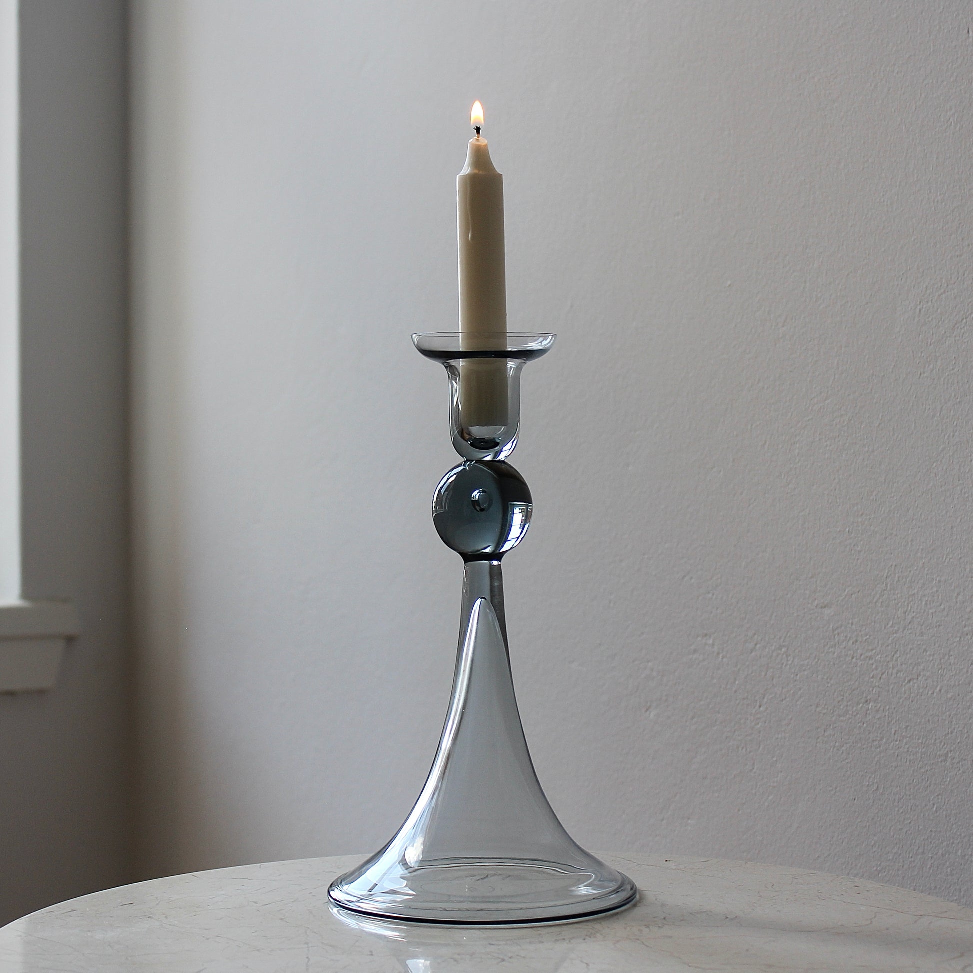 This stunning mid-century candle holder was designed by Vicke Lindstrand for Kosta glassworks in the mid 1950s, making this an early example of his work! The design features hand-blown transparent smoky blue glass with a beautiful sphere detail that holds an air bubble at the centre.