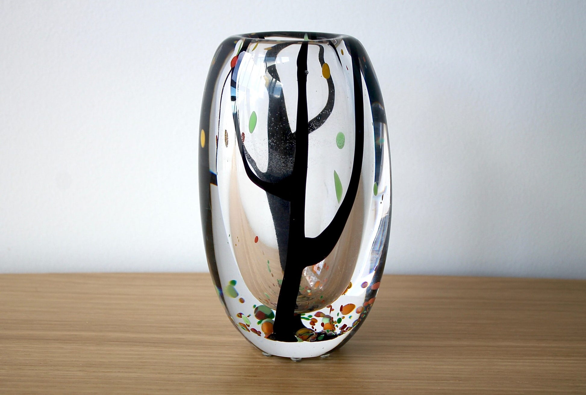 Featuring handblown solid crystal formed into an oval shape that encases an internally decorated black and multi-coloured tree motif - an absolutely stunning design! It is signed Kosta H 1753 Lindstrand' on the underside.
