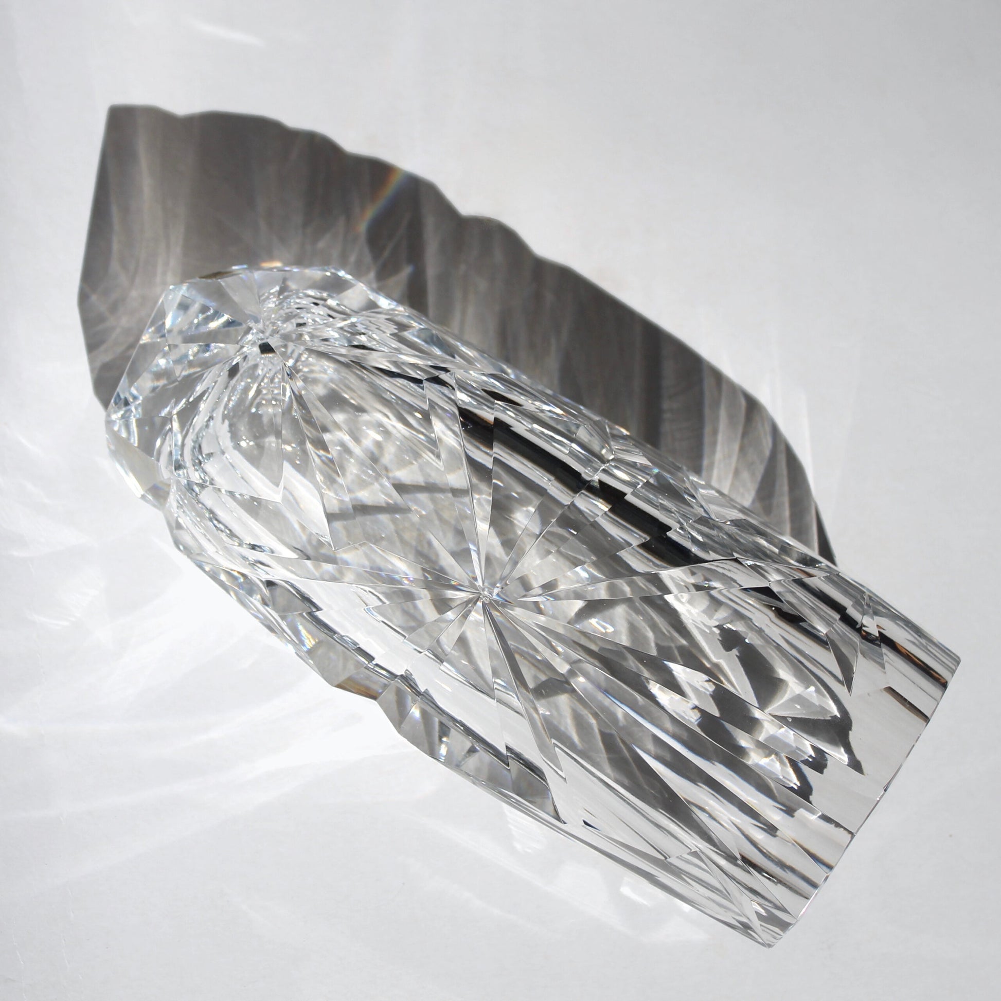 This original Modernist vase features super solid hand-formed cut clear crystal with irregular faceted sides. The movement that this creates in the vase is stunning and the light interacts with the design beautifully. This large vase impressively weighs over 5kg and is a testament to Lindstrand’s experimentation with the optic possibilities that cut glass allowed. The model LS2771 design dates from the 1966 Kosta catalogue. This version would have been produced sometime in the 70s when Kosta added '4' to the production numbering system to designate vases. Vicke Lindstrand retired in 1973 and Kosta was renamed in 1976 'Kosta Boda'.