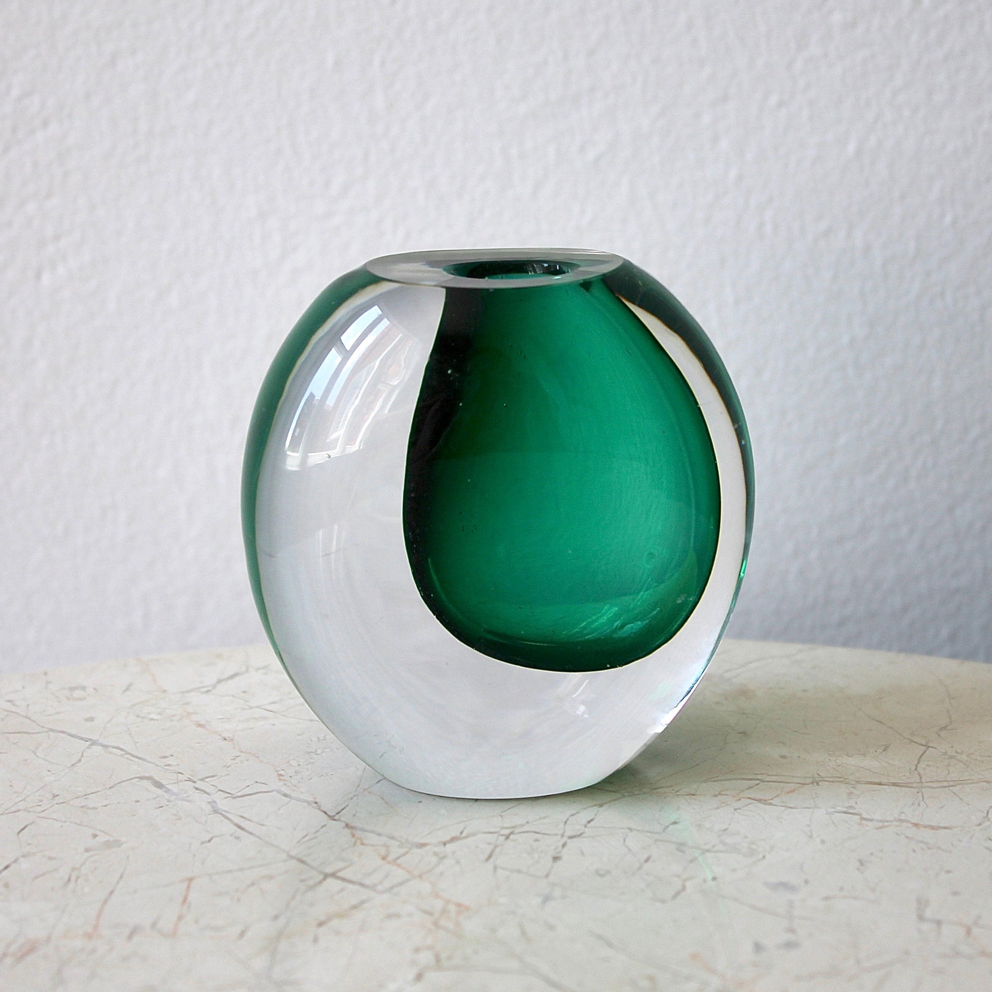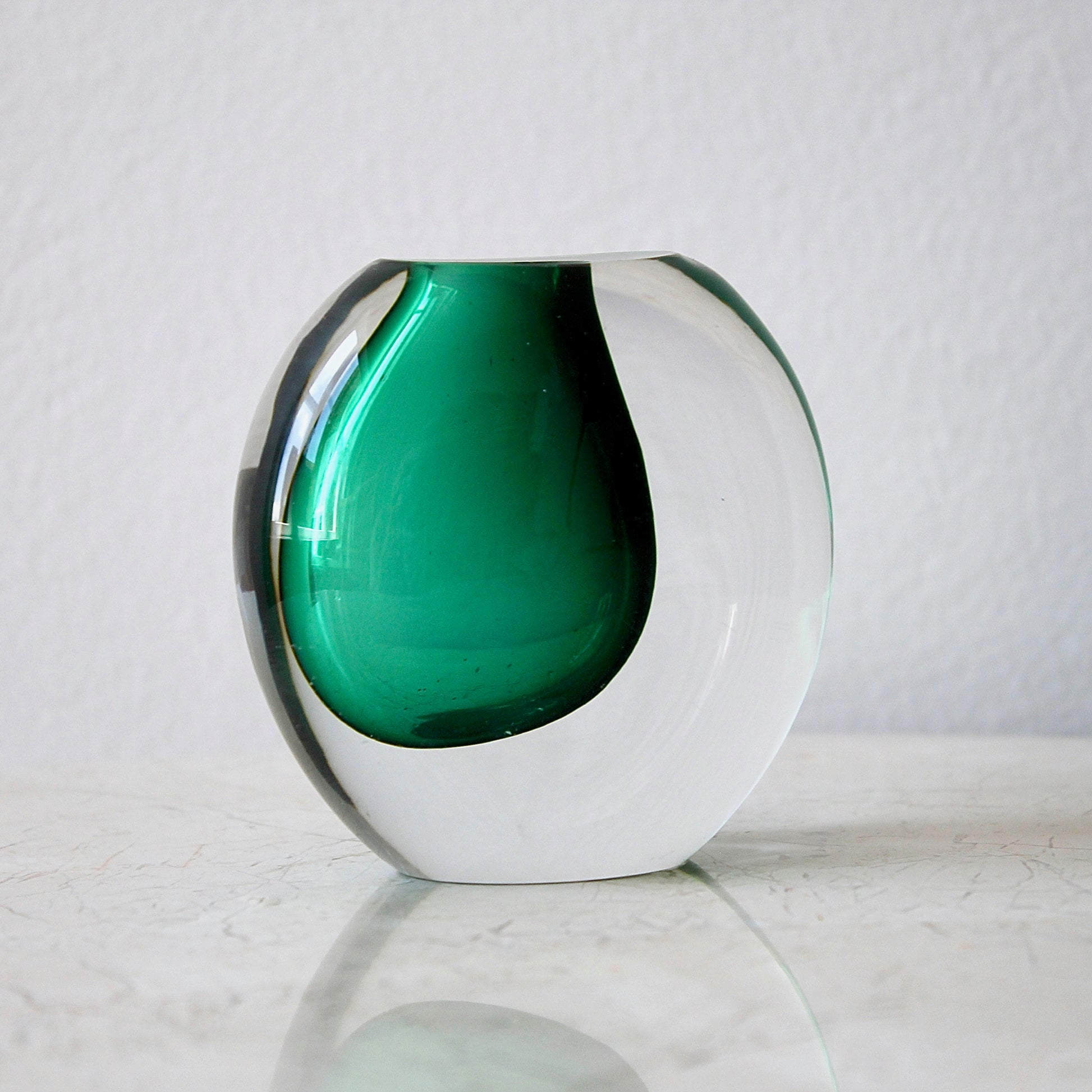 This cutey was designed by Vicke Lindstrand in the late 50s while he was Artistic Director at Kosta glassworks. The beautiful asymmetric design features solid handblown clear crystal with an ombre emerald underlay.