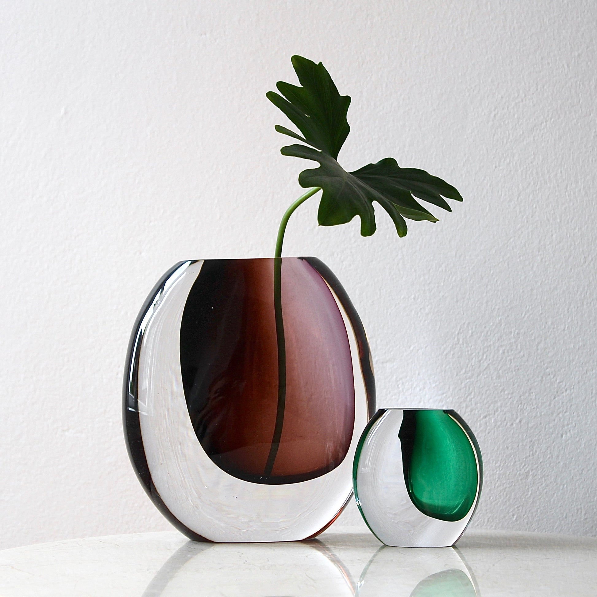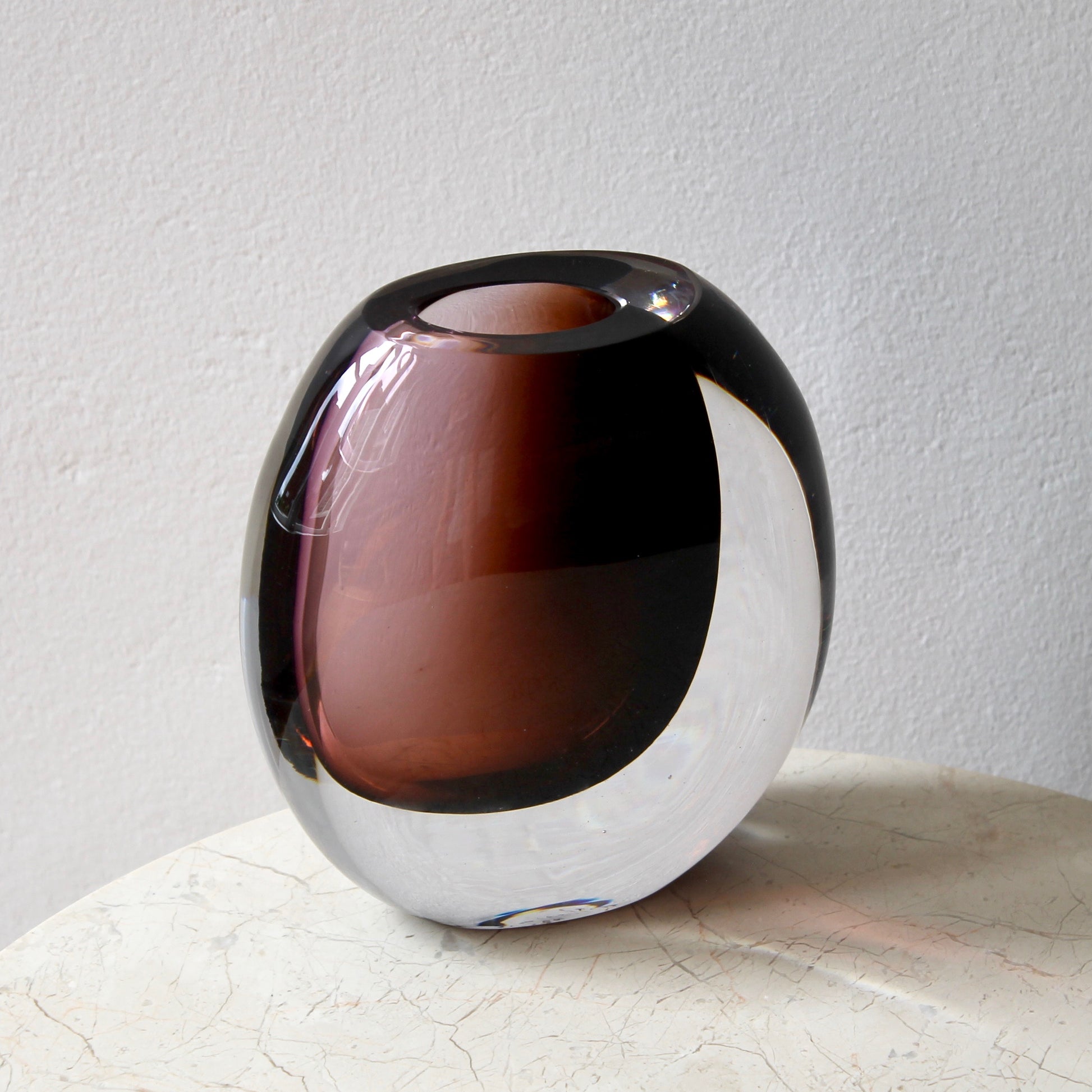 This model was designed by Vicke Lindstrand in the late 50s while he was Artistic Director at Kosta glassworks. The beautiful asymmetric design features super solid handblown clear crystal with a deep ombre copper underlay.