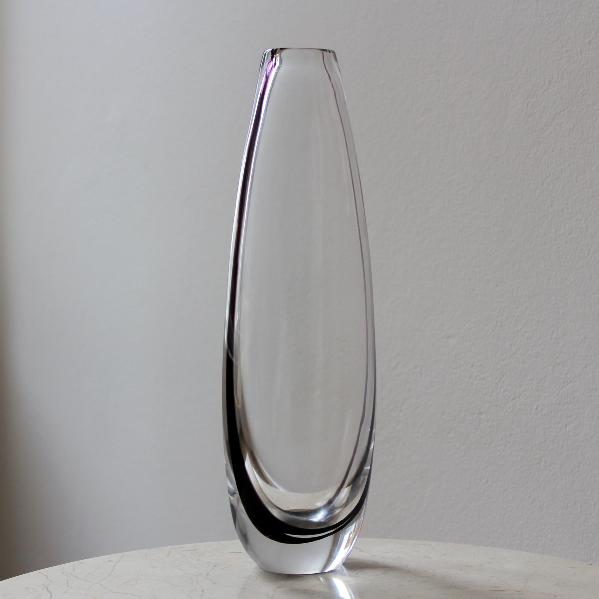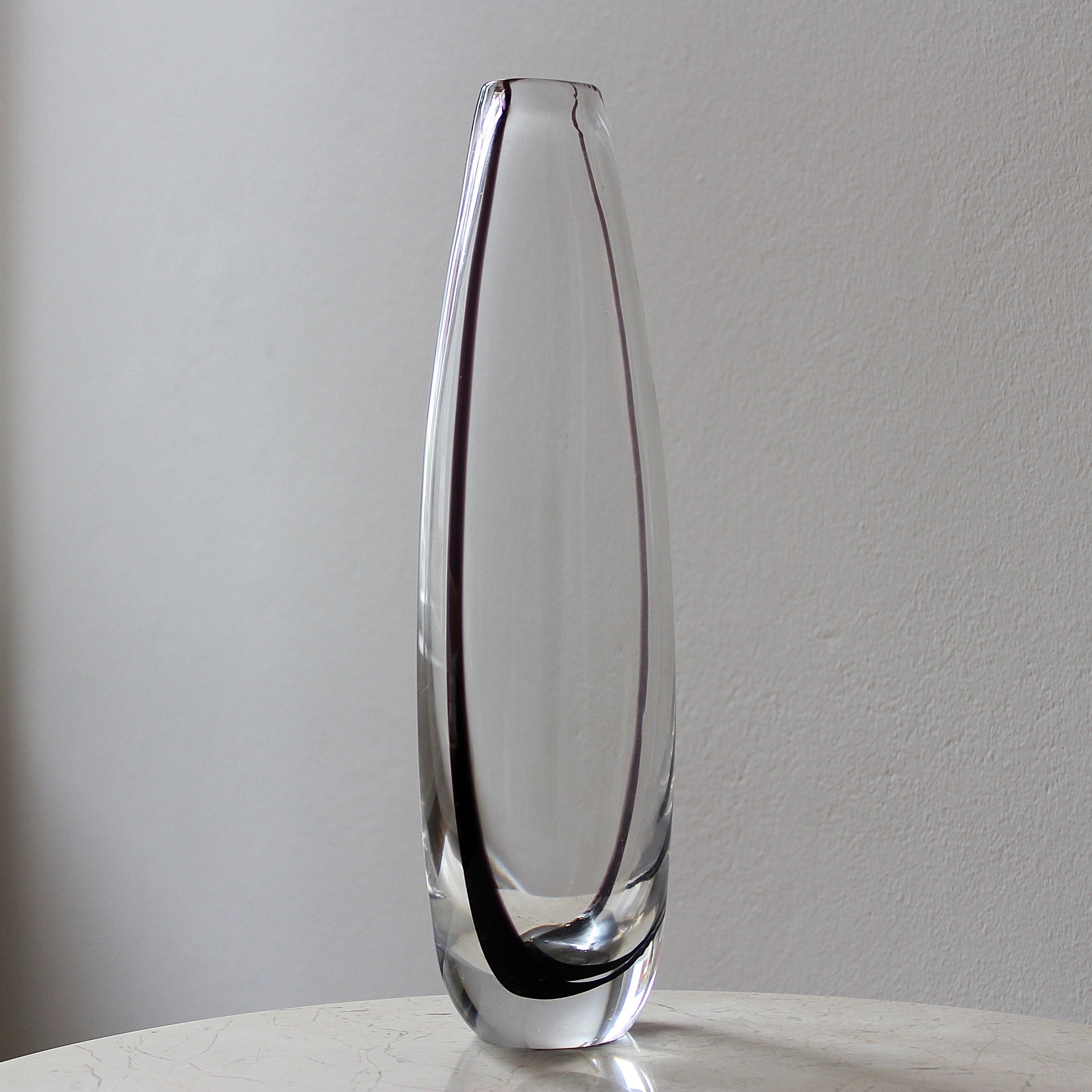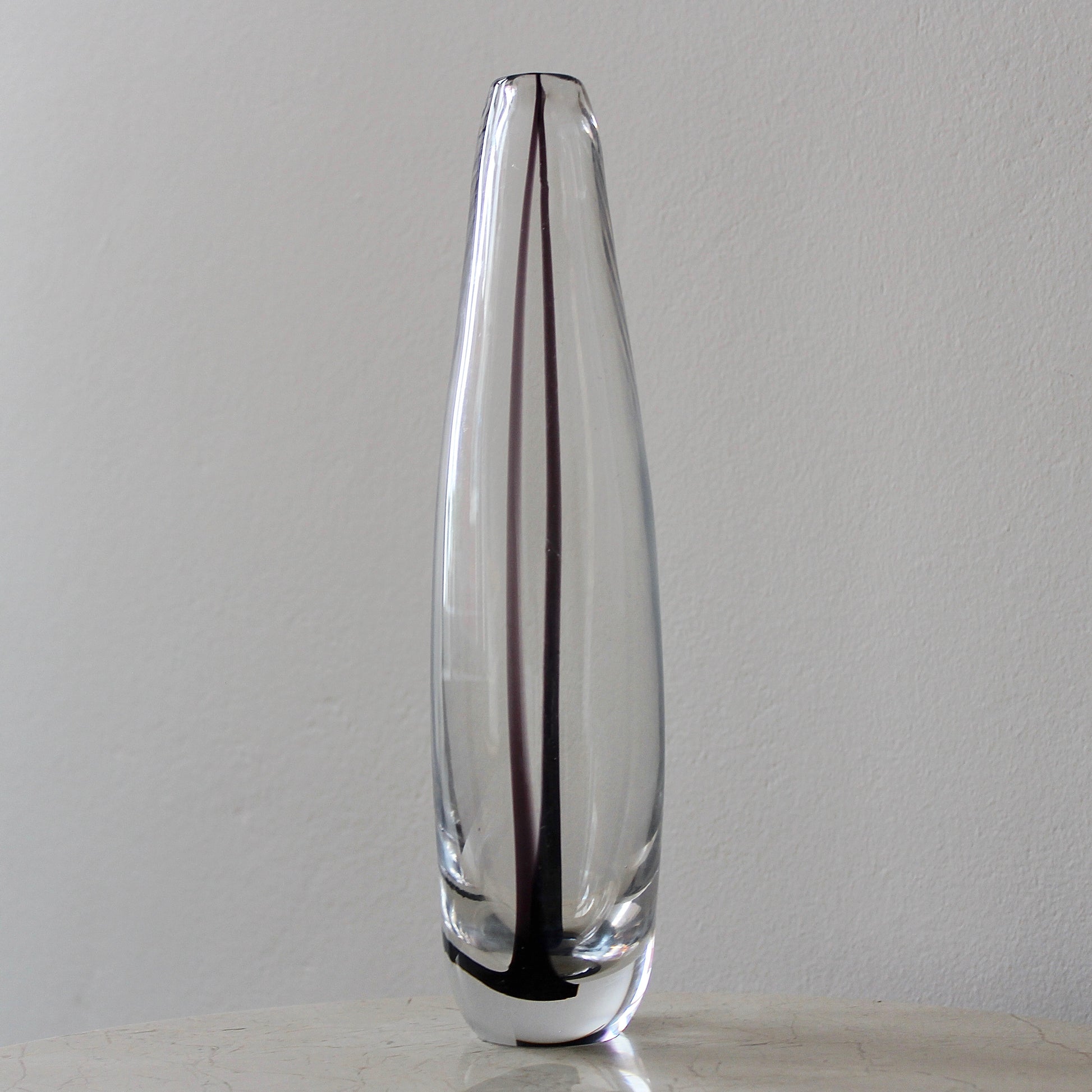 This elegant tall minimalist vase features heavy clear hand-blown glass with an internal black swirl that is reflected within the piece. It was designed by the famous Vicke Lindstrand for Kosta glassworks in the 1950s.