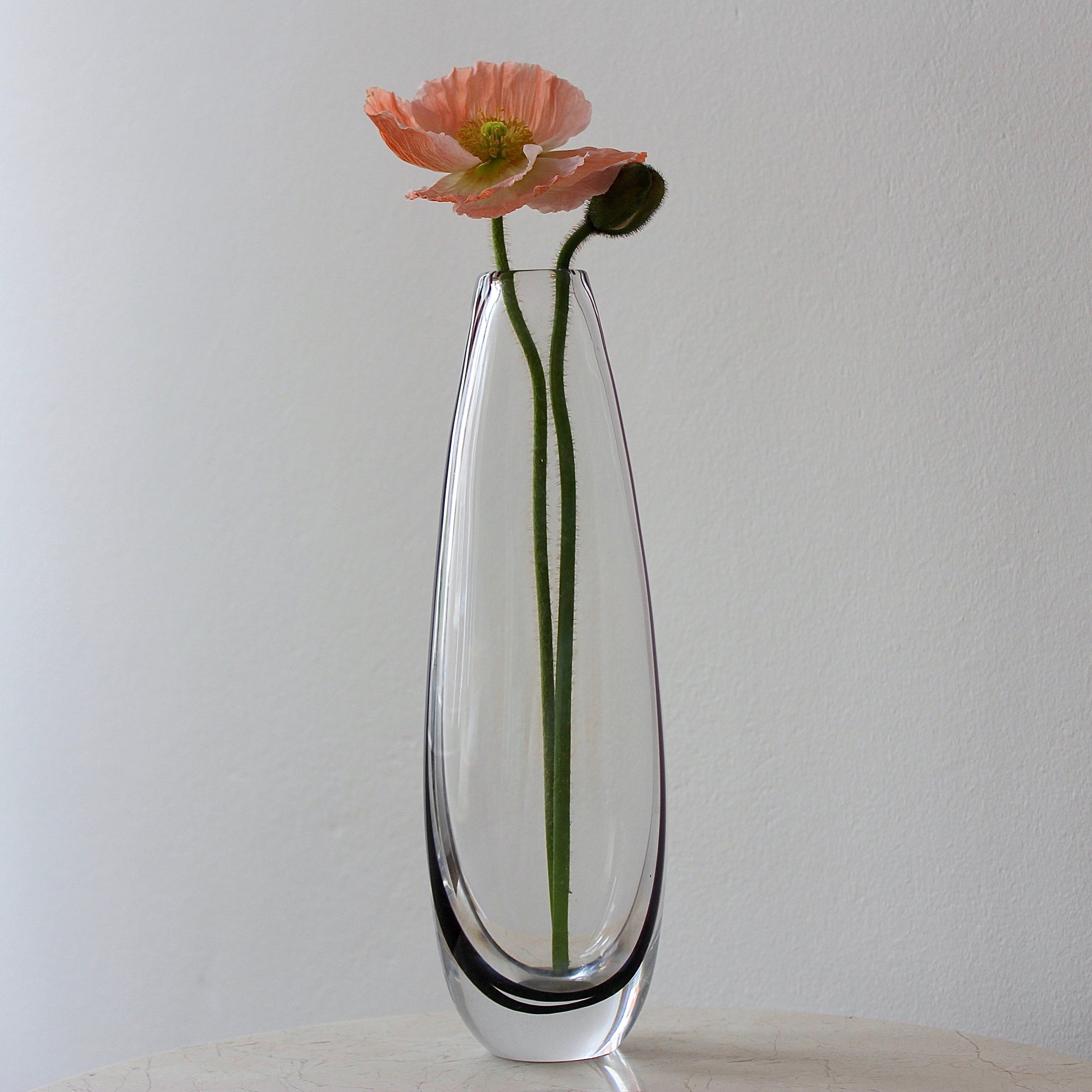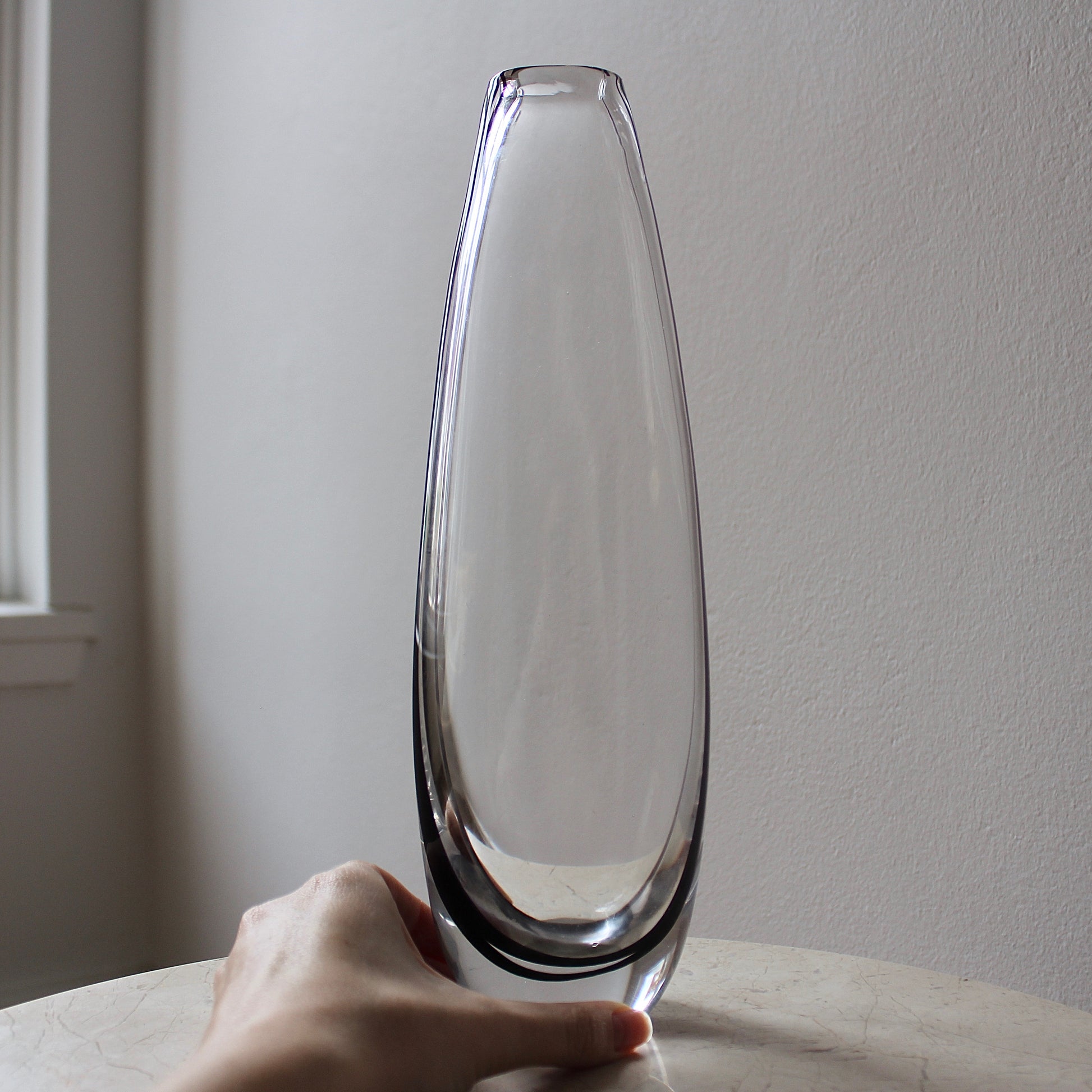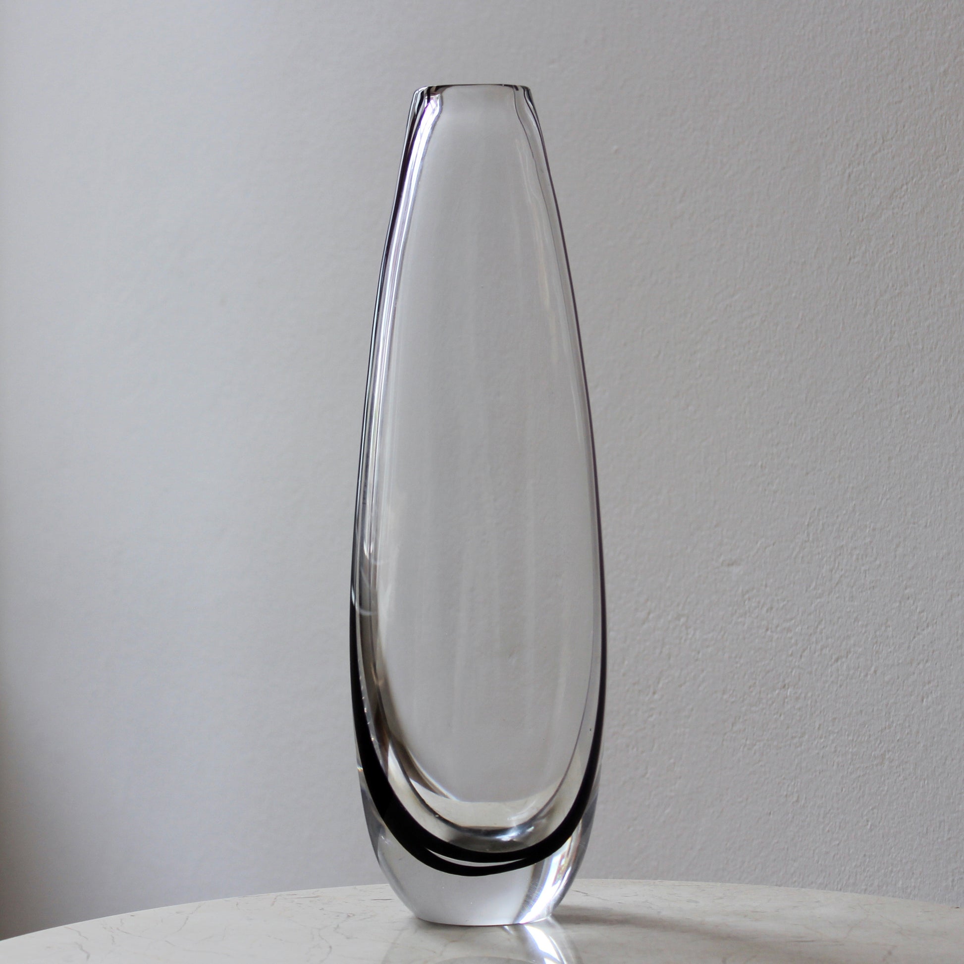 This elegant tall minimalist vase features heavy clear hand-blown glass with an internal black swirl that is reflected within the piece. It was designed by the famous Vicke Lindstrand for Kosta glassworks in the 1950s.
