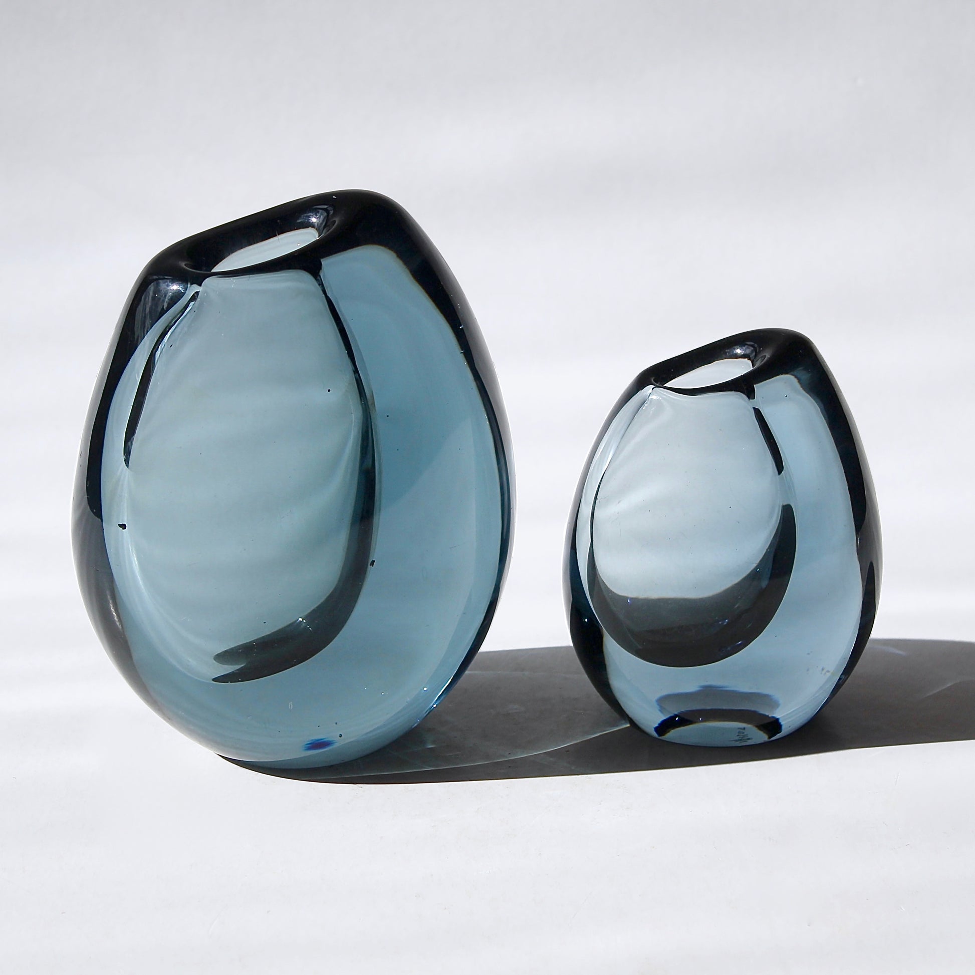 This lovely set of original mid-century vases belong to the ‘Dark Magic’ series designed by Vicke Lindstrand for Kosta glassworks in 1958. They feature transparent twilight-blue tinted solid crystal that has been handblown to create an asymmetrical form with a teardrop shaped cavity.