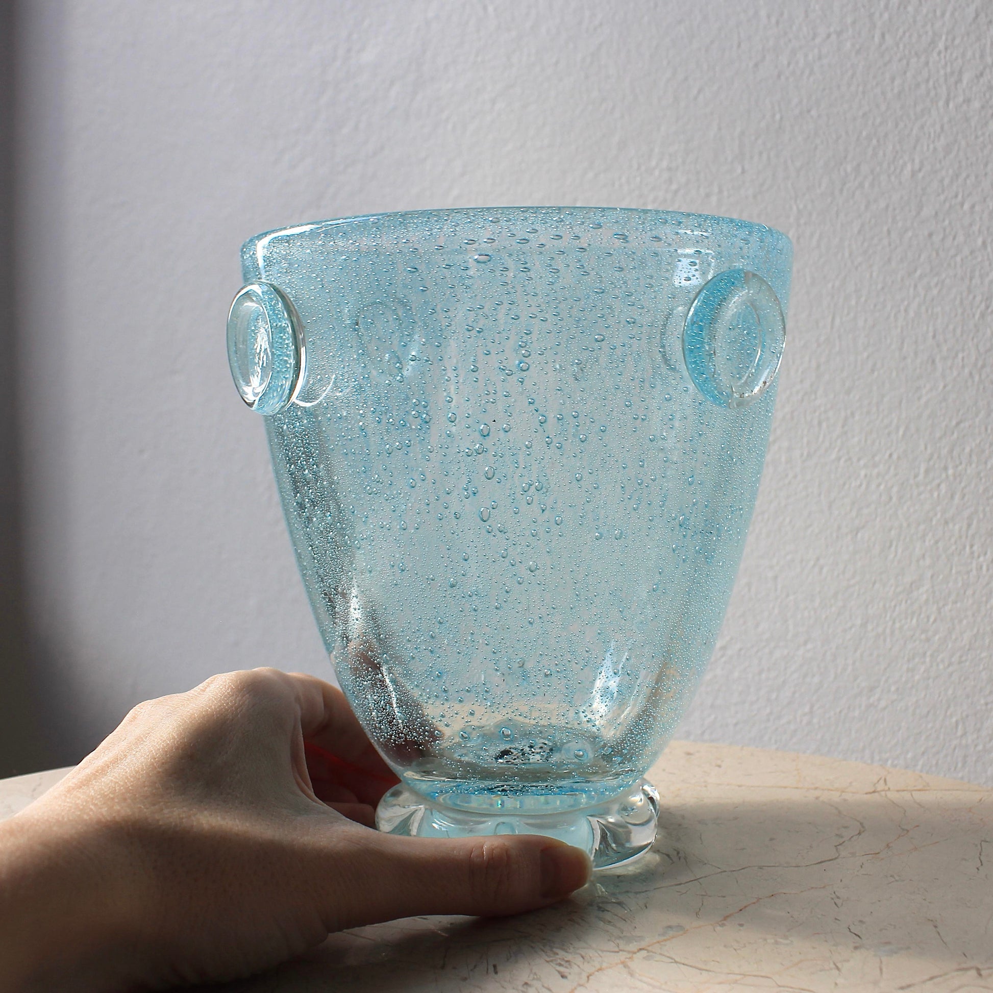 This beautiful rare vase features heavy aqua-blue glass with internal bubbles and appliqué medallions. It was likely designed by famous Dutch glass artist Willem G. de Moor for Flygsfors glassworks sometime between 1939 and 1942 during his tenure as artistic director.